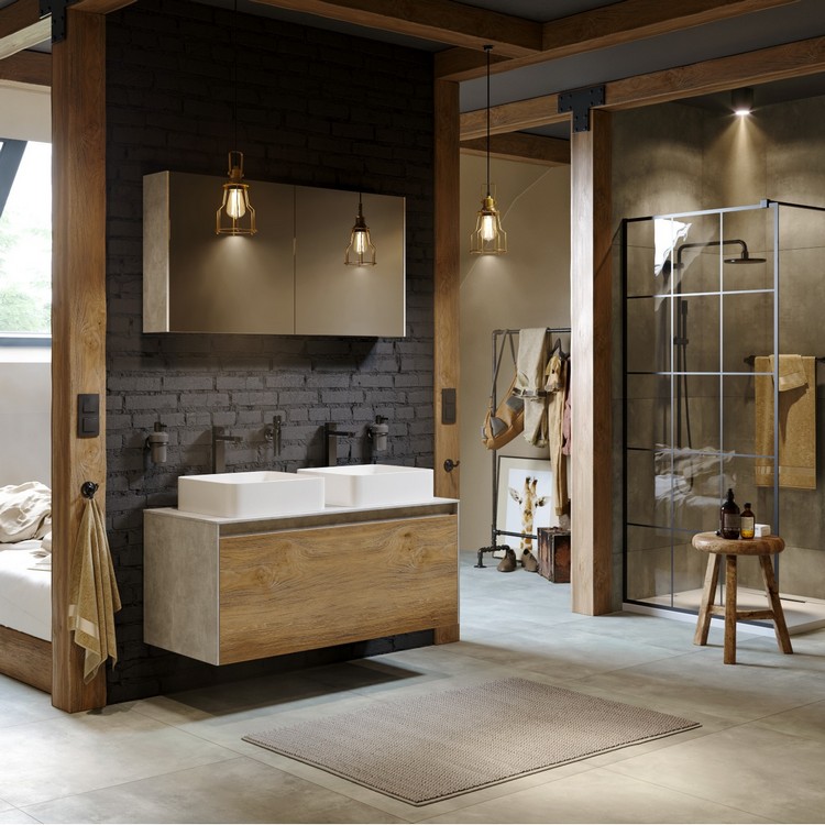 • Корпус тумбы 120 цвет "дуб балтийский" + фасад тумбы 120 цвет "бетон светлый" + две керамические раковины Kirovit Олимпия 56.