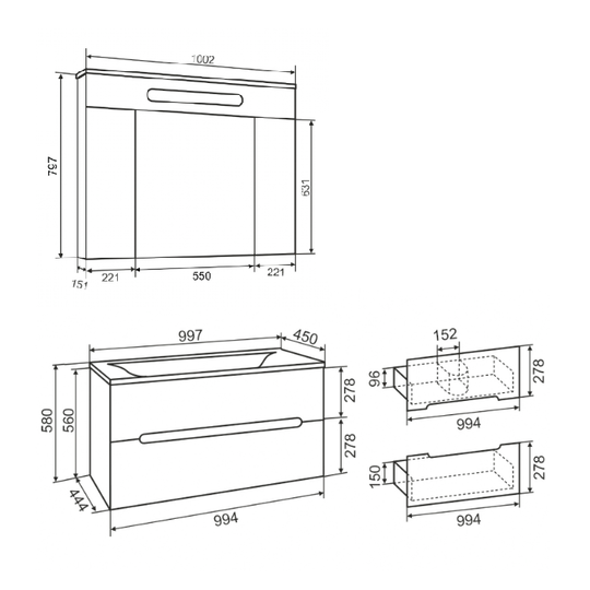Тумба Olivia 100 оснащена двумя выдвижными ящиками на шариковых направляющих скрытого монтажа с доводчиками. Ящики легко открываются благодаря удобным вырезам на фасаде.