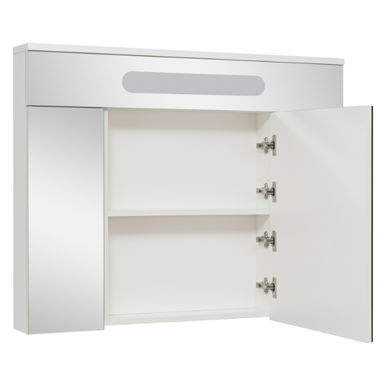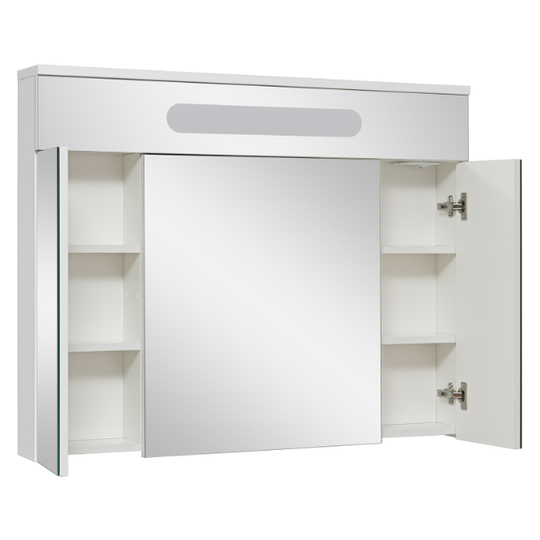 Зеркало-шкаф Olivia 100 оснащен тремя распашными зеркальными дверцами. Блок розетка/выключатель расположен внутри шкафа. Полки под хранение обеспечивают порядок внутри. Петли на дверцах со встроенным доводчиком.