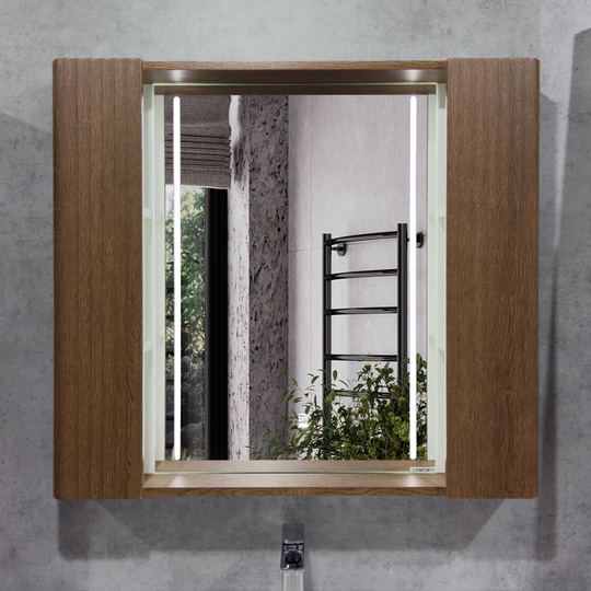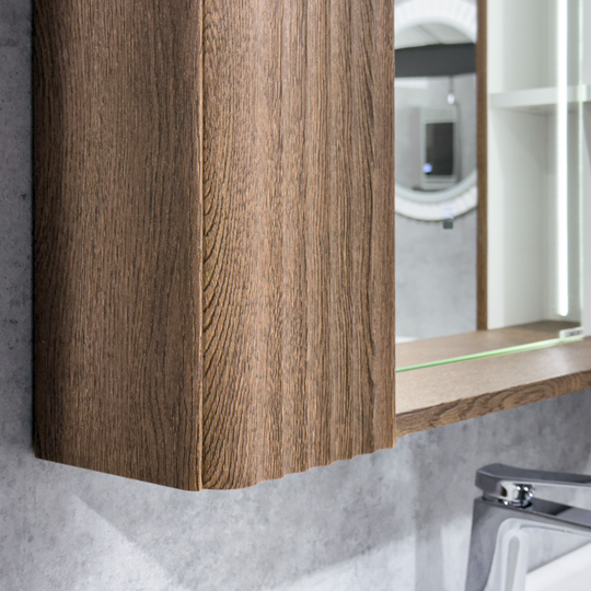 Зеркало-шкаф Comforty Ангара 90 - зеркальное высококачественное полотно с амальгамой на основе серебра. Боковые фасадные панели декорированы вертикальной фрезеровкой. За каждой из боковых панелей по две полки, доступ к которым осуществляется со стороны зеркала. В модели применяется декоративная плёнка с эффектом Soft-Touch с тиснением под текстуру дуба. Зеркало оборудовано линейной вертикальной LED подсветкой с бесконтактным включателем со встроенной функцией регулировки яркости. Температура подсветки: 6000-6500К холодная. Центральная часть задней поверхности зеркала оборудована нагревательным элементом, избавляя его от появления конденсата. Подключение к сети 220В с помощью евровилки. Длина кабеля - 950 мм.