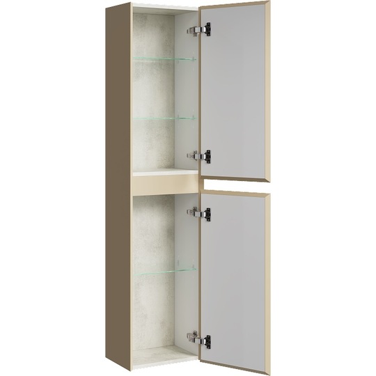 Пенал Aqwella Geometria 35 оснащен двумя дверцами на петлях с мягким закрыванием, внутри расположены полочки. Фасады и боковины с обработкой торцов под углом 45 градусов создают лаконичность и изящный, почти монолитный силуэт в закрытом состоянии. Все грани имеют округлую фрезеровку, обеспечивая приятные тактильные ощущения при открывании. Внутри - отделка под светлый камень.