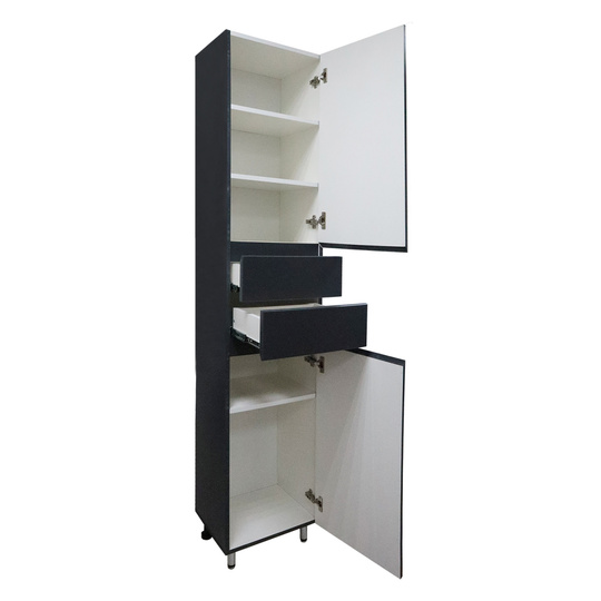 Пенал Azario Эстима 40 оснащен сверху и снизу двумя распашными дверцами на доводчиках, а посередине двумя выдвижными ящиками без доводчиков. В верхнем распашном фасаде две полочки внутри, в нижнем - одна полочка. Пенал установлен на хромированные ножки. Корпус изготовлен из ЛДСП, фасады МДФ толщиной 16 мм. Корпус и фасады производства Kronospan. Бока и фасады крашеные итальянской эмалью.