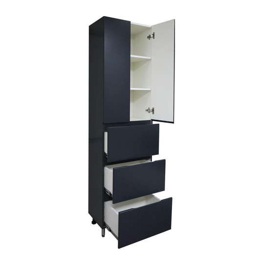 Пенал Azario Эстима оснащен двумя распашными фасадами на доводчиках, за которыми спрятаны две полочки, и тремя выдвижными ящиками без доводчиков. Пенал установлен на хромированные ножки. Корпус изготовлен из ЛДСП, фасады МДФ толщиной 16 мм. Корпус и фасады производства Kronospan. Бока и фасады крашеные итальянской эмалью.