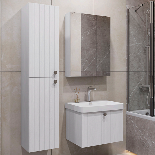 Пенал для ванной Истра 35 с двумя створками. Петли створок оснащены механизмами плавного закрывания. Фасады пенала изготовлены из МДФ, фрезерованы вертикальным узором и облицованы пленкой имитирующей текстуру дерева ясень беленый. Полки из влагостойкого ЛДСП регулируются по высоте. Ручки из цинкового сплава в цвете состаренный черненый. Шкаф-колонна может быть подвешена с правым или левым расположением петель. Для выбора ориентации колонну нужно перевернуть.