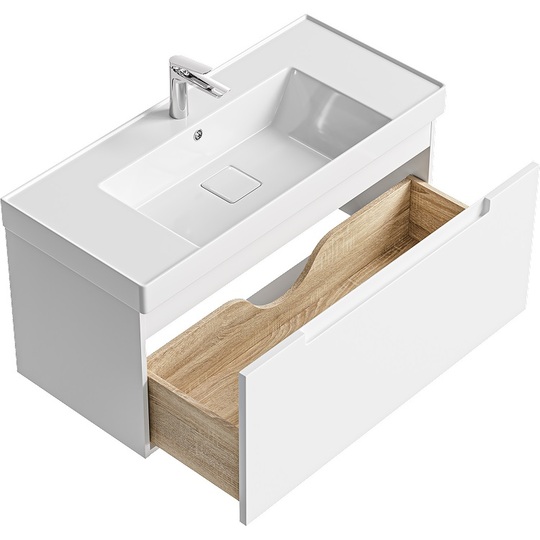 Подвесная тумба Ванкувер 101 оснащена одним ящиком с механизмом мягкого закрывания и тщательно организованным внутренним пространством с отделкой под дерево. Лаконичный фасад крашеный в белый цвет с интегрированной ручкой-зацепом подчеркивают чистоту форм и делают использование особенно удобным. Мебельный умывальник с декоративной вкладкой подчеркивает современный характер коллекции, а оптимальная глубина чаши обеспечивает комфортное ежедневное использование.