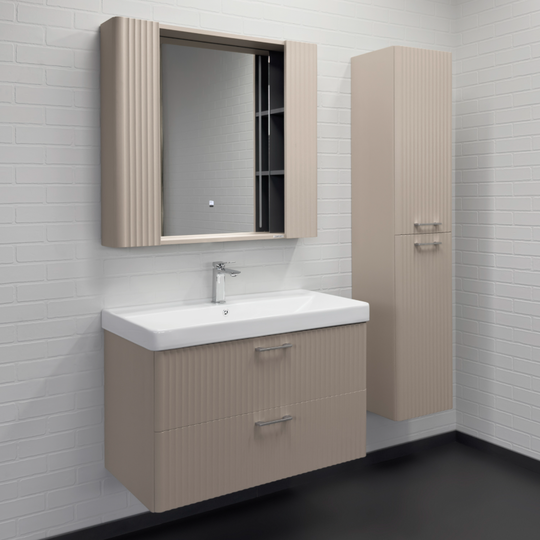 Тумба Comforty Ангара 90П оснащена двумя выдвижными ящиками с системой плавного закрывания. Фрезеровка фасадов выполнена в дорической форме. Внутренние детали тумбы выполнены из влагостойкого ЛДСП. Металлические ручки скобы под естественный хват цвета "жемчужный никель". Тумба подготовлена для подключения водоснабжения сзади и снизу.