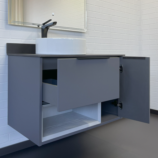 Подвесная тумба Comforty Джанкой 90 оснащена одним ящиком и створкой, оборудованными системой плавного закрывания. Предусмотрено пространство для открытого хранения. На фасадах тумбы черные матовые алюминиевые ручки. Круглая раковина-чаша установлена на черную столешницу из керамогранита. В комплекте также пристенный плинтус. Ниша открытого хранения сделана из МДФ в пленке серого цвета с текстурой дерева. Торцы вставки спилены под углом.