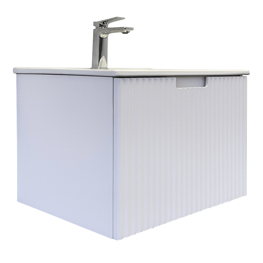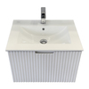 Подвесная тумба с одним широким выдвижным ящиком оснащенным направляющими с системой плавного закрывания. Фасад тумбы изготовлен из МДФ, фрезерован вертикальным узором и окрашен белой матовой эмалью. Тумба подготовлена для подключения водоснабжения снизу и сзади.