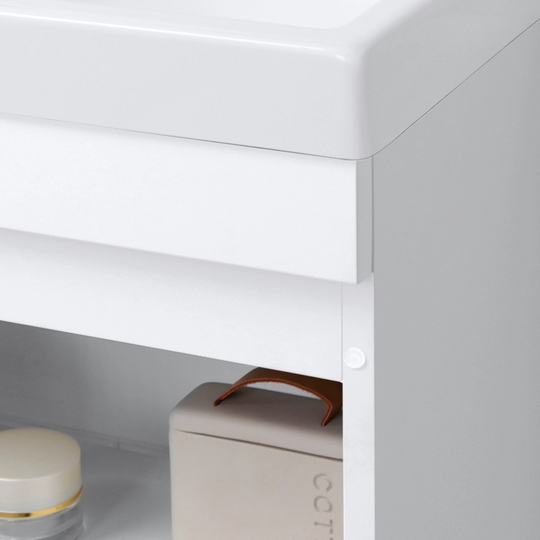 Тумба Итана Alexa 50 покрыта ПВХ пленкой с высокой степенью глянца. Петли с доводчиками обеспечивают плавное открывание и закрывание дверцы. Ручки интегрированы в фасад, что исключает возможность случайного удара о фурнитуру.